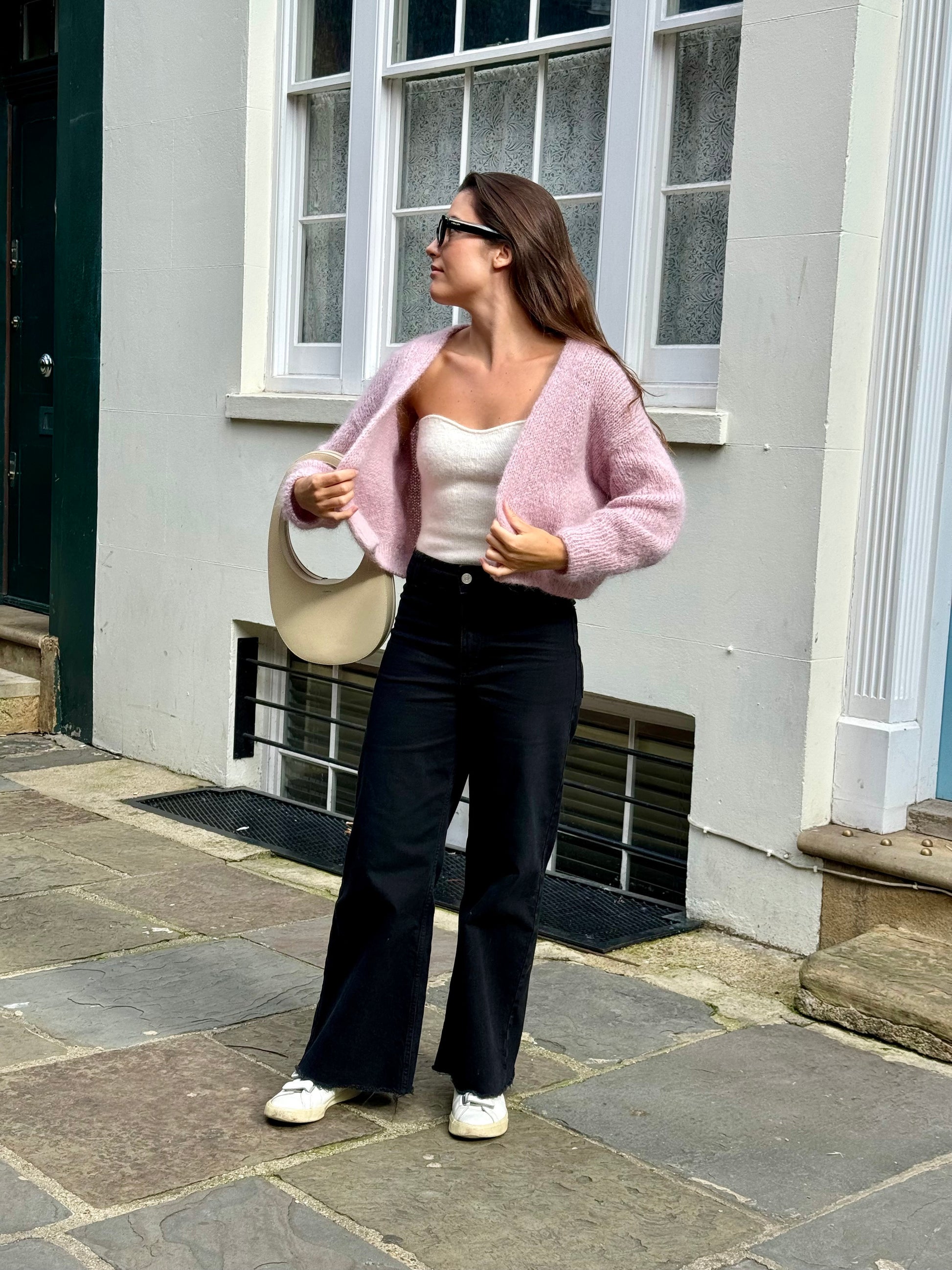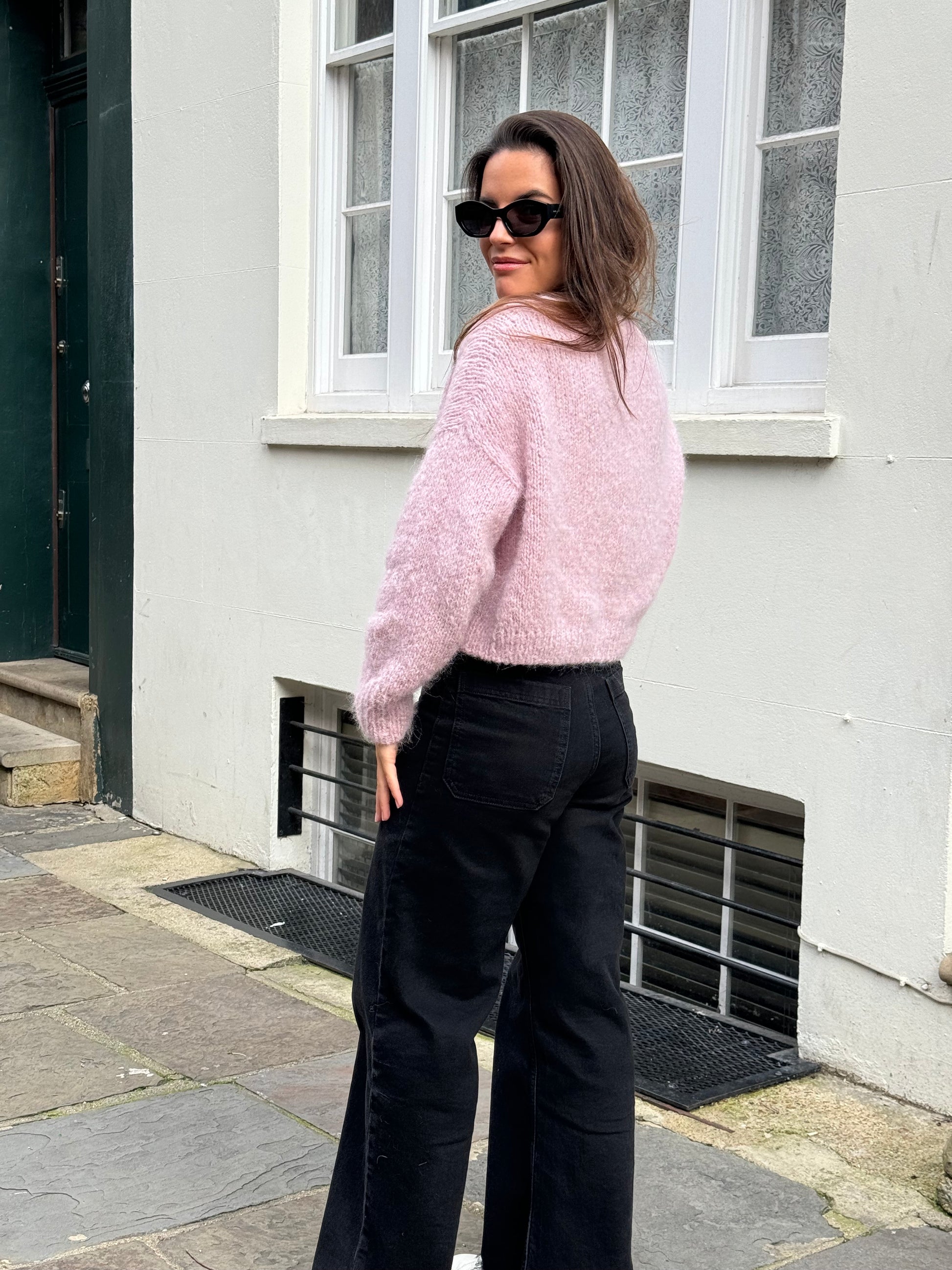 This is a gorgeous soft cardigan made from alpaca and wool blend. It’s designed to be oversized and cropped to end just near your waistline. It’s made without buttons, finished with a chunky edge.